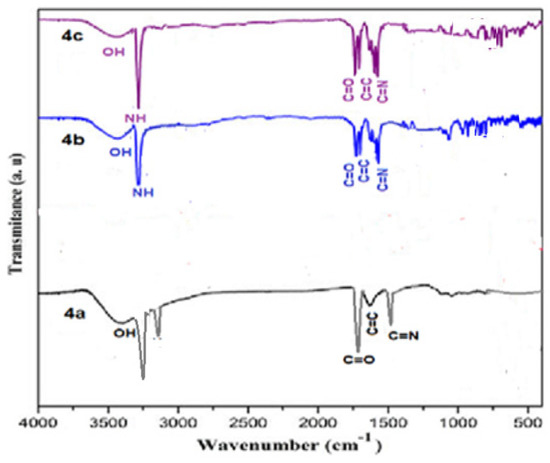 IR spectrum data of compound 3 indicate powerful peaks at 1623, 1688, 2226, and 3362 cm−1 attributed to C=C, C=O, C≡N and NH groups, correspondingly (Figure 1). The spectra of the prepared porphyrazine 2H-Pz 4a revealed a wide peak at 1518 cm−1, which is related to the absorption band of the C=N moiety. The absorbance ratios of the C=N vibrating at 1512, 1510, and 1515 cm−1 [26] (see Experimental section), for Zn-Pz 4b and Ni-Pz 4c, correspondingly, are about 310 cm−1 fewer than that for product 2H-Pz 4a, showing that the nitrogen atom (azomethine) is ligand bonded to metal ions in the products. Absorbance band of the NH bond in product porphyrazine 2H-Pz 4a is responsible for two distinct signal bands at 3356 and 3370 cm−1. Because the absorption band of the NH bond is not present in the spectrum of metallic porphyrazines 4b and 4c, the NH nitrogen is implicated in ligation to metal (Figure 2).