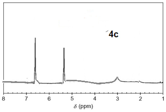 The 1H-NMR spectra of compound 3 revealed a singlet at δ = 2.93 that was assigned to the NH proton, which was consistent with the structure (Figure 3). The assigned formulation matches the novel tetra-nitrile 3′s elemental analyses results and 13C-NMR spectroscopic information (see Experimental section, Scheme 1, and Figure 4). The 1H-NMR spectroscopy of 2H-Pz 4a, a free-metal porphyrazine-based network polymer, exhibits two NH protons at = δ 1.82 and 6.45 [27] (Figure 5). The existence of a peak in the 1H-NMR spectra of 2H-Pz 4a that corresponds to the hydrogen atom in the NH portion (deshelled by tetracyclic structure) assures verification of asymmetric tetradentate ligand. The disappearance of the pyrrole ring-NH signal in metal-porphyrazine network polymers’ 1H-NMR spectra supports the complexation process (Figure 5 and Figure 6).