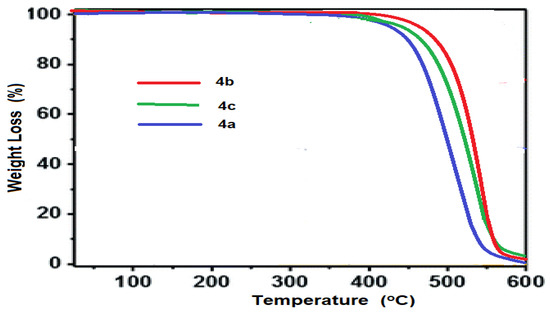 The thermal stability of porphyrazine polymers was investigated as well. Figure 8 shows the TGA thermograms of the produced porphyrazines. The thermograms demonstrate that metal-free porphyrazine network 4a has a one-step decomposition temperature (Td) at 428 °C that really is significantly comparable. On heating at a rate of 10 K/min, metal-porphyrazine networks 4b and 4c show enhanced thermal stability, with a one-step decomposition occurring at 437 °C for Zn-Pz and 434 °C for Ni-Pz.