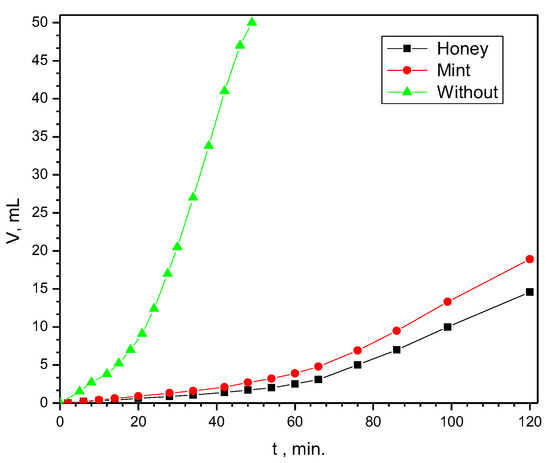The volumetric measurement of evolved hydrogen was used to track the development of the corrosion reaction. The corrosion rate, CR, in mL min−1 was calculated using the slope of a straight line, illustrating the variability in hydrogen volume and exposure time. The following equation, i.e., Equation (4), was used to calculate the IE: