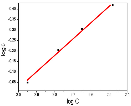 The adsorption isotherm model may be derived by assuming that the inhibitory effect is primarily due to the adsorption at metal/solution contact [35]. Adsorption isotherms can provide basic information about the adsorption of inhibitor on the metal surfaces. The isotherm may be driven by the determination of the fractional surface coverage data (θ) as a function of inhibitor concentration. Hence, empirically determining which isotherm best suits the adsorption of inhibitor on the aluminum surface is required. The Freundlich isotherm model describes the experimental data for surfaces coverage, as illustrated in the following equation: