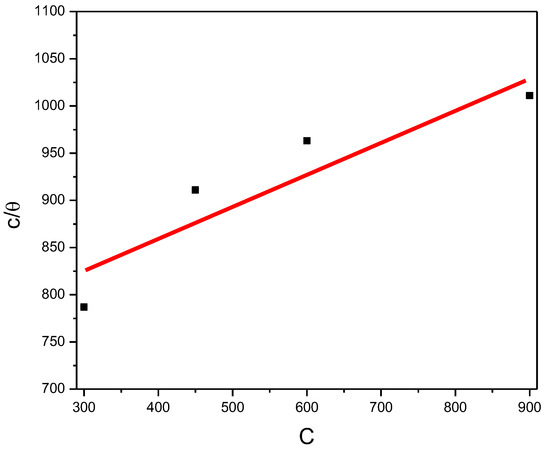On the aluminium surface, a plot of data in Table 8, (c/θ) vs. c, for the employed inhibitor (Figure 7) indicates that the adsorption does not follow the Langmuir adsorption isotherm, R2 = 0.7728.