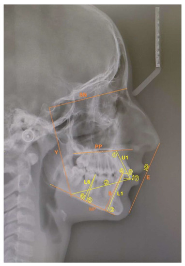 Legends: 1: U1/PP (°) is the angle formed between the maxillary central incisor (U1) long axis and the palatal plane (PP) and indicates maxillary incisor inclination; 2: U1/Y axis (mm) is the distance between the incisal edge of maxillary central incisor perpendicular to the Y axis (formed by dropping a line from the sella perpendicular to the SN line) indicates horizontal maxillary incisor distance; 3: L1/MP (°) is the angle formed between the mandibular central incisor (L1) long axis and the mandible plane (MP) and indicates mandibular incisor inclination; 4: L1/S axis (mm) is the distance between the incisal edge of the mandibular central incisor perpendicular to the S axis (formed by dropping a line through the posterior conture of symphysis perpendicular to the MP line) and indicates horizontal mandibular incisor distance to S axis; 5: L6/MP (°) is the angle between the mandibular first molar (L6) long axis (line passing through the mesial cusp tip and the mesial root tip) and the mandibular plane, and indicates mandibular first molar inclination; 6: L6/MP (mm) is the distance between the mesial cusp tip of the mandibular first molar perpendicular to the mandibular plane and indicates vertical mandibular first molar distance; 7: overjet is the horizontal distance from the maxillary incisor tip to the labial surface of the mandibular incisor; 8: overbite is the vertical distance from the mandibular incisor tip to the maxillary incisor tip; 9: U1/E line is the horizontal distance from the labial surface of the maxillary incisor perpendicular to the E line.