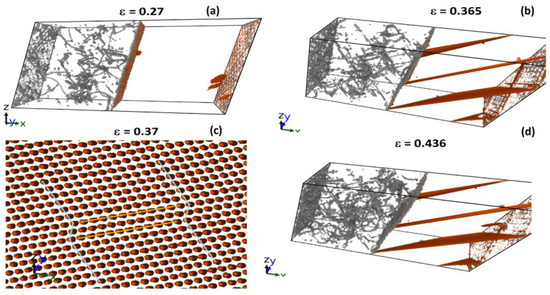 The development of plastic relaxation in copper begins with the nucleation of partial Shockley dislocations in the [110](111) system. At initial pressures from −3 to 30 GPa, growing loops of partial dislocations and stacking faults bounded by them initially fill the space of the material, as seen in Figure 11a for ε = 0.14, after which they are rather quickly replaced by a dislocation network due to the active emission of secondary dislocations in the material, as seen in Figure 11b for ε = 0.24. At initial pressures above 30 GPa, after the formation of primary loops of partial Shockley dislocations, secondary dislocations nucleate from the stacking faults, as shown in Figure 11c for strain ε = 0.17. The formation of a dislocation network occurs without the stages of filling the volume of the material with stacking faults, as seen in Figure 11d for ε = 0.21.