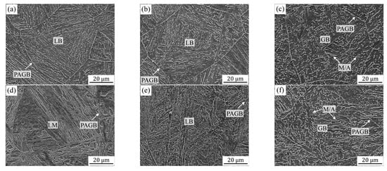 Shown in Figure 3 are the typical microstructures of the simulated CGHAZs with carbon contents of 0.04 and 0.12 wt.%, which display the characteristics of martensitic and bainitic structures, i.e., lath martensite (LM), lath bainite (LB) and granular bainite (GB). Based on the observation of microstructure, it is found that the microstructure of the 0.08C sample is similar to those of 0.04C and 0.12C samples under various heat input conditions. This study focuses on the analysis of these two groups of samples. It can be seen that the microstructures of the 0.04C sample changes from LB to GB with an increase in heat input from 10 to 50 kJ/cm. Although LB can be obtained at the heat input of 10 and 20 kJ/cm, the lower heat input induces a higher cooling rate and a decrease in the bainite transformation temperature [11]. From a comparison of Figure 3a,b, it can be found that the lath bundles obtained under the lower heat input have a parallel structure and the coarse packet structure penetrates the entire austenite grain. However, the bainite obtained at 20 kJ/cm shows an approximate staggered arrangement. The above difference should be the main reason for the variation in impact toughness, which also produces better evidence regarding the crystallographic structure. However, at the lowest heat input, the microstructure obtained in the 0.12C sample is mainly composed of LM (Figure 3d). Furthermore, with the increase in heat input, the microstructure gradually changes into LB and GB, in which fine carbides and coarse martensite/austenite (M/A) constituents can be clearly seen, respectively (Figure 3e,f). Many previous studies [12,13,14] have confirmed that it is difficult to obtain high impact toughness in GB structures with coarse M/A, which is also the essential reason for the lower impact energy obtained at the heat input of 50 kJ/cm.