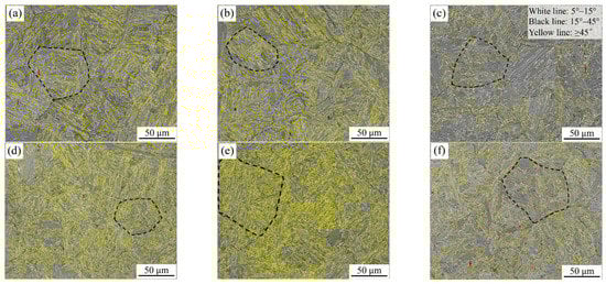 Reconstructed crystallographic packets of the simulated samples with 0.04 wt.% C (a–c) and 0.12 wt.% C (d–f) under the different heat inputs: (a,d) 10 kJ/cm, (b,e) 20 kJ/cm and (e,f) 50 kJ/cm.