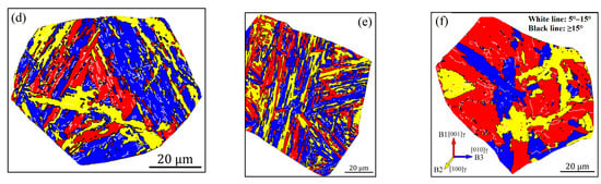 Reconstructed crystallographic Bain groups of the simulated samples with 0.04 wt.% C (a–c) and 0.12 wt.% C (d–f) under the different heat inputs: (a,d) 10 kJ/cm, (b,e) 20 kJ/cm and (e,f) 50 kJ/cm.
