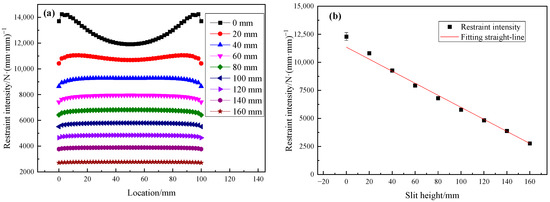 - The restraint intensity is significantly affected by the slit height. As the height increases, the restraint intensity decreases linearly. The reason for this is that with the height increase, the constraint effect of the anchor welds decreases and the deformation of the groove root is enhanced. The restraint intensity is not evenly distributed along the groove; when the slit heights are as small as 0 mm and 20 mm, the restraint intensity at the two ends is increased, which is mainly because the ends of the test welds are close to the anchor welds, and the deformation is significantly decreased. When the heights increase to more than 40 mm, the deformation at the ends of the test welds is enhanced due to the notch effect of the slits and the restraint intensity at the middle section is increased.