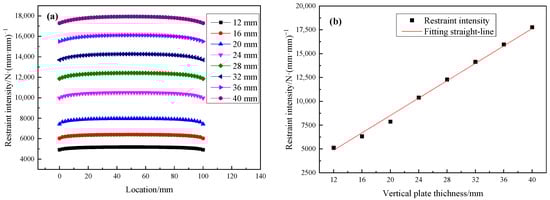 - The vertical plate thickness has a significant impact on the restraint intensity. As the vertical plate thickness increases, the restraint intensity increases almost linearly. The distributions of the restraint intensity along the grooves fluctuate a little; the data points at both ends of the test welds are slightly reduced due to the notch effect of the slits.