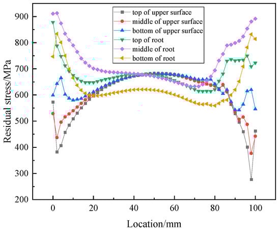 - The welding residual stresses on the backing weld surface are higher in the middle and lower at both ends, while the weld root shows opposite results. In general, stresses at the weld root are greater than those on the weld surface. The mean residual stress value at the weld root increases with the increase in the restraint intensity but not uniformly, i.e., it is slow at first and then increases rapidly. A prediction model of the residual stress was produced using cubic fitting as follows: where S is the welding residual stress and r is the logarithm of the restraint intensity. The errors between the finite element simulations and predictions were about 8%. Through the prediction model, the residual stress of actual Ti80 alloy workpieces can be estimated before welding, and a corresponding strategy for avoiding cracks can be generated.