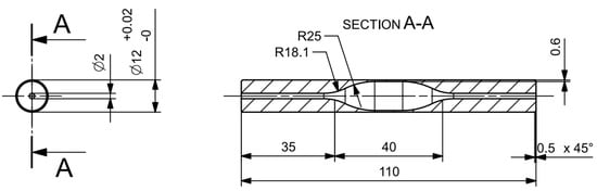 To analyze the influence of wall thickness on fatigue life, an ad hoc design of specimens was made, as shown in Figure 1. Commonly, the specimens used in other studies [1,2,3] are those with the basic “dog-bone” geometry, while for standard specimens, the typical geometry is solid in this work, and 12 mm diameter cylindrical hollow specimens were used. Internally, a cavity was manufactured, allowing for the resistant section to be modified, which is helpful for investigating the strength at different wall thicknesses. In general, when studying fatigue in classical machined specimens, the failure mechanism consists of the nucleation of a crack frequently on the external surface of the component or in correspondence with an inner defect, which, once propagated, leads to breakage. Thanks to layer-by-layer deposition and selective powder melting, the additive manufacturing process allows for the fabrication of internally hollow components without subsequent cutting machining. This can also lead to the presence of defects on the internal surface of the component, which cannot be eliminated and can therefore affect fatigue life. In addition, considering different wall thicknesses and, consequently, a lower amount of material can lead to a smaller absolute number of defects and a subsequent influence on the number of cycles the material can withstand. The overall dimensions of the specimen were considered based on the geometry of the testing machine used. The wall thicknesses studied were 2.4 mm, 1.2 mm, and 0.6 mm, slightly above the minimum value achievable with SLM technology. Figure 1 shows the specimen with a wall thickness in the central part of 0.6 mm.