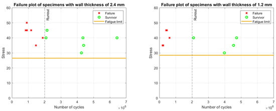 The measured values show that the specimens have a low fatigue strength when compared to cast aluminium alloys [28], which increases in case treatments are performed. In particular, it can be seen that the best in terms of fatigue life is the T6 thermal treatment. This treatment led to a percentage increase of 81% for the 2.4 mm thickness, while it led to an increase of 82% in the 1.2 mm specimens. The standard deviation value was the main factor that influenced the increase in fatigue strength. The highest dispersion was recorded in the specimens with only the stress relief treatment. Figure 2 shows just this by indicating how the failure data are distributed for the 2.4 mm and 1.2 mm thickness series. However, this parameter was grown by the treatments performed, obtaining the minimum value and, thus, the best condition found when performing the heat treatment.