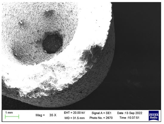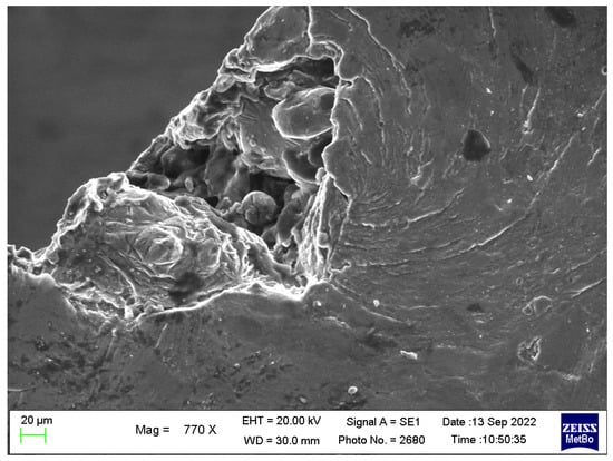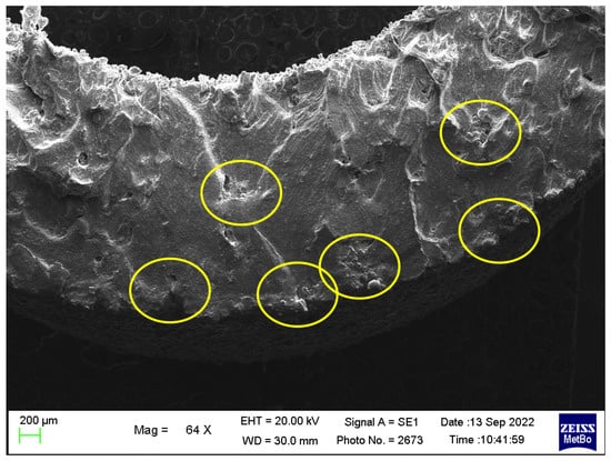 The general fracture surface appearance involves a smooth area around the initial propagation site, for example, in Figure 7 and Figure 8, where the presence of defects and fracture triggers of very significant size was also noted. These are mainly present on the outer surface of the specimen, as in Figure 7. In Figure 8, multiple fatigue crack origin sites can be identified due to a higher material resistance.