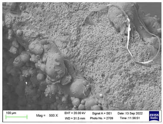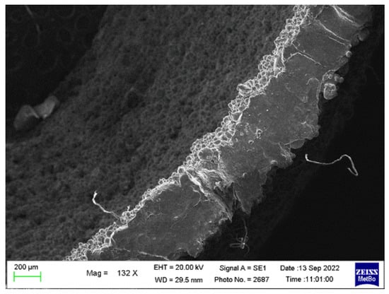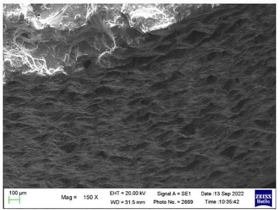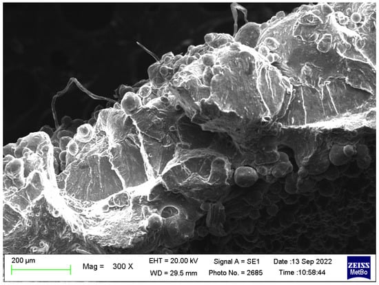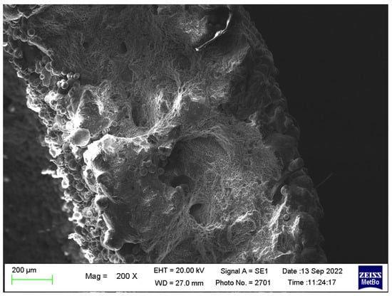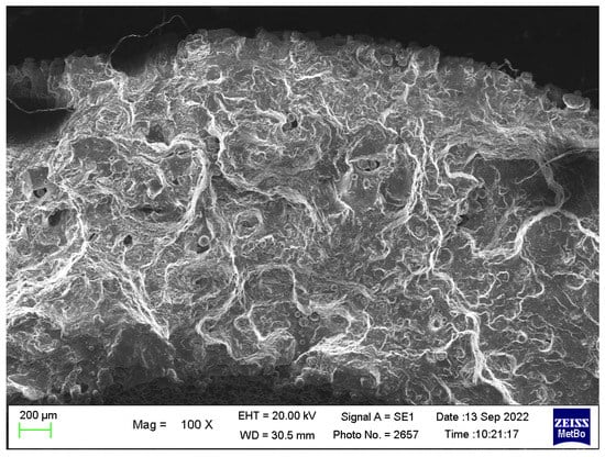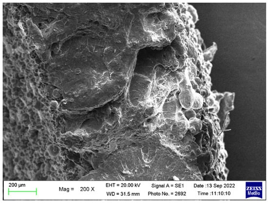 The case of the 0.6 mm thick samples was not taken into consideration for this analysis due to their specific characteristics in relation to the dimensions of the defects. Since less material was present in the thinner specimens, the defects that could have led to subsequent cracking of the specimen should be statically less. Due to the high porosity of the material, however, it was possible to observe that the defects were of a large size. For this reason, no difference between the various thicknesses was noticed. This behavior is more highlighted for the 0.6 mm thick samples. In this series, as can be seen from the SEM in Figure 5, the defects present extended along the specimen’s entire wall, leading to a drastic drop in the fatigue strength value. A similar feature appears in the 1.2 mm thick specimens’ SEM observations, as seen in Figure 6.