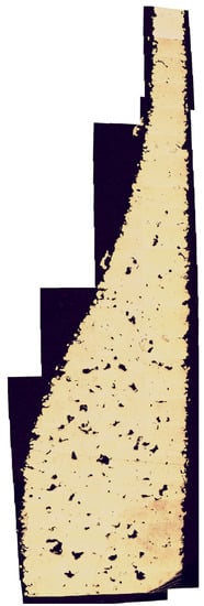 In Figure 14, the longitudinal section of the same specimen is shown. It is possible to see that the porosity distribution is quite uneven. As a consequence, the density of the specimen is weakly related to its fatigue resistance, which is more dependent on the locally measured porosity. Moreover, the unmelted powder trapped in the material contributes to the density but is removed in the polishing operations needed to perform the metallographic analysis [29].