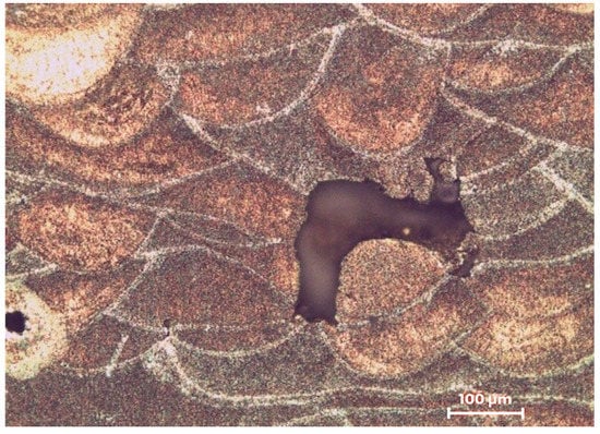 A deeper analysis of the pores described above was later made by images obtained from the metallographic microscope. By the acid attack of the sample with Keller’s reagent, the defects in the edges of the melt pools typical of the additive manufacturing process were recorded, as in Figure 15 and Figure 16. In fact, observing the common shapes of the additive process, there is a grain difference between the inside of the melt pool and the edge. Due to a different solidification rate, you get a coarser grain in the outermost part than in the interior. This difference in the solidification process is one of the causes of the emergence of pores, together with the presence of unmelted powder. While the effect of the pores shown in Figure 15 is minimal as regards the fatigue life, the cavities similar to the one shown in Figure 16, depicting a transversal section, may act as a pre-existing intergranular crack, which is mainly detrimental.