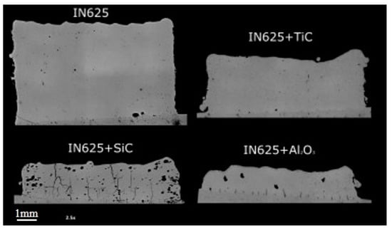 Spherical or nearly spherical particles are widely regarded as feasible reinforcements. Li et al. [66] studied the effect of spherical and non-spherical WC-reinforced on microstructure, mechanical properties and wear resistance of LMD Inconel 625 superalloy. The study showed that the wear rate of spherical WC/IN625 composite coatings was smaller than that of non-spherical WC/IN625 composite coatings. This indicated that spherical WC/IN625 composite coating had higher wear resistance. In addition, the size of the reinforcement has great influence on the mechanical properties of NAMMC [67]. Cao et al. [68] studied the effects of micron-TiC and nano-TiC on the microstructure and mechanical properties of IN625 alloy by laser AM process. The results showed that the grain of nano-TiC/Inconel 625 composite was significantly refined compared with micro-TiC/Inconel 625 composite. The hardness, tensile properties and wear resistance of the composite samples were significantly improved, and the ductility was not significantly reduced. AlMangour et al. [69] prepared micro-scale and nano-scale TiC particle-reinforced 316L stainless steel matrix by LBPBF, and analyzed the effect of ceramic particle sizes on the crack propagation of metal matrix composite. The results showed that the grain size was significantly reduced by adding nano-scale TiC. It was found that the crack propagated along the boundary of the molten pool in 316L stainless steel as shown in Figure 6A. But no cracks were found to appear inside nano-TiC/316L composite (Figure 6C), because nanoscale TiC particles were able to prevent crack propagation.