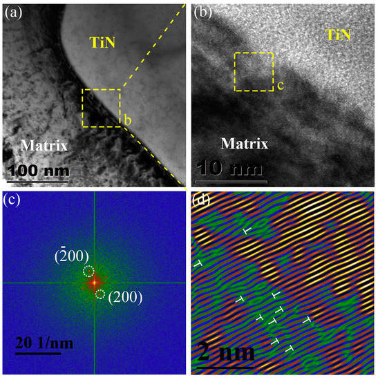 (a) The bright field image of the interface between TiN particle and matrix; (b) the HRTEM image of the interface between TiN particle and matrix; (c) the corresponding FFT patterns of yellow frame in (b); (d) the Inversed FFT image of (c) [59].