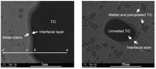 The physical matching and interface bonding between the matrix and the reinforcement should be considered comprehensively when choosing the reinforcement. For instance, the lattice structure difference between TiC particles and nickel-based alloy is smaller, indicating that the better physical matching is easy to form between TiC ceramic particles and nickel-based alloy matrix. Cooper et al. [58] investigated the influences of the reinforcements with different lattice structure, such as SiC, Al2O3 and TiC, on IN625 Nickel-based superalloy manufactured by laser AM. The results showed that the surfaces of SiC/IN625 and Al2O3/IN625 composites were rough and porous, and cracks exist. However, the surface of TiC/IN625 composite was smooth and without defects. It can be seen from Figure 1 that there are many pores and large cracks in SiC/IN625 and Al2O3/IN625 composites, while a denser microstructure appears in TiC/IN625 composite. This indicates that TiC ceramic particle with a better physical matching is suited to be used as the reinforcement for nickel-based alloys. In addition, the good interface bonding between reinforcement and matrix is a key factor in the preparation of high density and high strength laser AM NAMMC parts. Wang et al. [59] studied the microstructure and mechanical properties of TiN reinforced IN718 composites. It can be seen from Figure 2 that the interface between TiN particles and IN718 alloy is compact, and no second phase precipitates at the interface. In addition, lots of misfit dislocations distribute near the interface, which also give rise to additional reinforcement effect. Tensile strength of TiN/IN718 composite are higher than that of IN718 alloy. Hong et al. [60] studied the interface of LMD TiC/Inconel 718 composites, and found that a interface layer with the thickness of 0.8 to 1.4 mu formed between TiC particles and matrix, as shown in Figure 3. The interfacial layer is formed by the reaction of matrix and reinforcement into the composition of (Ti, M) C (M: Nb and Mo). The typical metallurgical bonding interface is helpful to improve the microstructure and mechanical properties of Inconel 718 alloy.