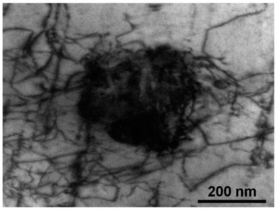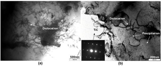 TEM micrographs of LENS-deposited IN625 TiC/Ni MMCs: (a) high density of dislocation in matrix and (b) large amount of precipitation interacting with dislocations [11].