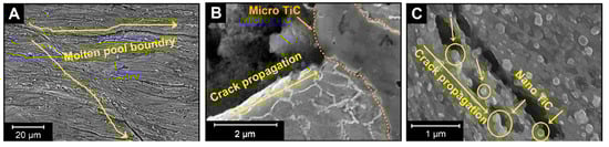 SEM image of crack propagation with (A) LBPBF 316L; (B) LBPBF micro-TiC/316L composite and (C) LBPBF nano-TiC/316L composite [69].