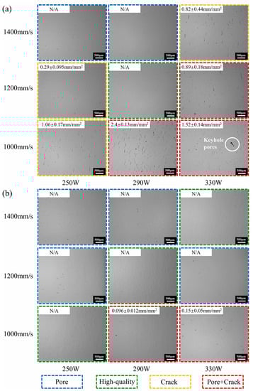 OM images of the polished surfaces of Inconel 738 alloy (a) without Y2O3 and (b) with Y2O3 fabricated by LPBF showing pore and crack under different laser powers and scan speeds as well as the corresponding crack density [57].