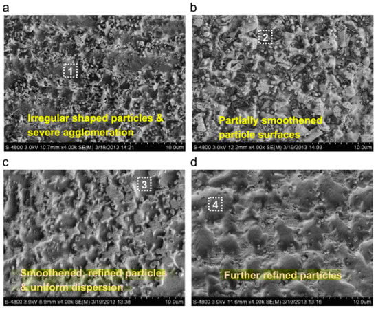 High-magnification SEM images showing composite structures of LMD-processed TiC/Inconel 625 parts using (a) P = 500 W, v = 900 mm/min, LEIPUL = 33 kJ/m; (b) P = 800 W, v = 900 mm/min, LEIPUL = 53 kJ/m; (c) P = 500 W, v = 300 mm/min, LEIPUL = 100 kJ/m; and (d) P = 800 W, v = 300 mm/min, LEIPUL = 160 kJ/m [67].