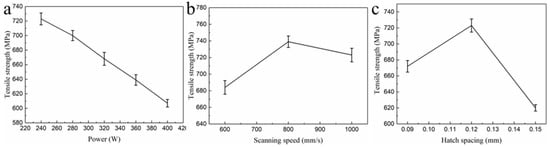 Effect of process parameters on the tensile strength: (a) power, (b) scanning speed, (c) hatch spacing [71].