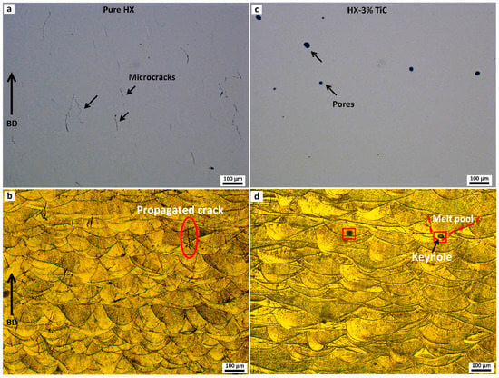 Defect distribution and molten pools in the built samples under optimum conditions: (a,b) Hastelloy X; (c,d) Hastelloy X matrix composite [72].