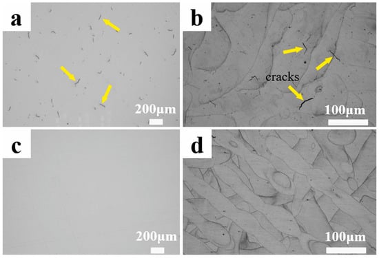 In addition to process parameter optimizing for controlling manufacturing defect, it has been proved by a large number of studies that adding ceramic particles to the metal matrix is feasible to eliminate cracks forming during laser AM process. For example, Han et al. [72] investigated the effect of nano-TiC on the distribution of defects and molten pool boundaries in LBPBF Hastelloy X matrix composites. They found that TiC particles addition eliminated obviously pores and cracks in the molten pool in Hastelloy X alloy (Figure 10). The yield strength (830MPa) and UTS (1150MPa) of LBPBF TiC/Hastelloy X composite are much higher than that the yield strength (690MPa) and UTS (920MPa) of LBPBF Hastelloy X alloy. Cheng et al. [73] studied the effect of adding Y2O3 on cracks and mechanical properties of LBPBF Hastelloy X alloy. It can be seen from Figure 11a that many cracks (yellow arrows) were found in the LBPBF Hastelloy X alloy. The results showed that the addition of Y2O3 eliminated the crack, and the microstructure uniformity of LBPBF Y2O3/Hastelloy X composite was improved (Figure 11).