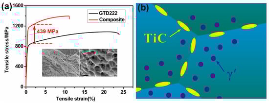 (a) Typical tensile stress-strain curves of LBPBF processed GTD222 alloy and TiC particle-reinforced Ni matrix composite; (b) schematic illustration of the strengthening mechanisms in TiC particle-reinforced Ni matrix composite [77].