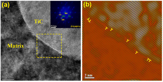 It has been demonstrated that the strength of laser AM NAMMC is able to be enhanced by the reinforcement without sacrificing plasticity, which is mainly attributed to some strengthening synergy mechanism, such as stress-transfer strengthening, grain refinement strengthening, Orowan strengthening and high-density dislocation strengthening [69,74,75,76]. Wang et al. [77] studied the strengthening mechanism of LBPBF TiC/GTD222 composites. As can be seen from Figure 12a, the yield strength (1270 MPa) and UTS (1390MPa) of LBPBF TiC/GTD222 composite are much higher than the yield strength (831 MPa) and UTS (1100MPa) of LBPBF GTD222 alloy. This is mainly due to Orowan strengthening of TiC particles evenly dispersed in the cellular and columnar structures (Figure 12b). Both TiC and γ’ phases prevent movable dislocations from moving (Figure 12). Yao et al. [78] deemed that the increased strength of TiC/IN718 composites alloy was mainly attributed to the combination of grain refinement strengthening and high-density dislocation strengthening. Zheng et al. [11] thought the strengthening mechanism of LENS TiC/IN625 composite was ascribed to a large number of dislocations around TiC particles (Figure 13), which was caused by the residual stress between the reinforcement TiC and the matrix IN625 alloy. Zhang et al. [5] considered that LBPBF TiC/GTD222 composite with high strength was concerned with the well-combined interface between matrix and TiC reinforcement (Figure 14a). The inset in Figure 14a shows the Fourier transform image of the carbide, and it can be identified as TiC particles. In addition, they found that there were a large number of dislocations (yellow symbols) at the interface between the matrix and the reinforcement due to the difference in lattice constants between matrix and the reinforcement (Figure 14b). Therefore, they believed that the increase in strength of TiC/GTD222 composite was attributed to the synergistic effect of load-bearing strengthening of particles and Orowan strengthening.