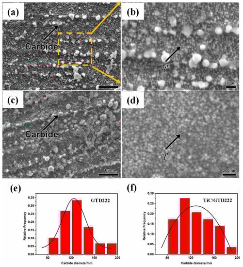 SEM images and corresponding to carbide particle size distributions after heat treatment: (a) GTD222, (b) Enlarged image of square area in Figure 14a, (c) TiC/GTD222 composite, (d) TiC/GTD222 local area magnification, (e) Carbide particle sizes distribution in GTD222, (f) Carbide particle sizes distribution in TiC/GTD222 composite [5].
