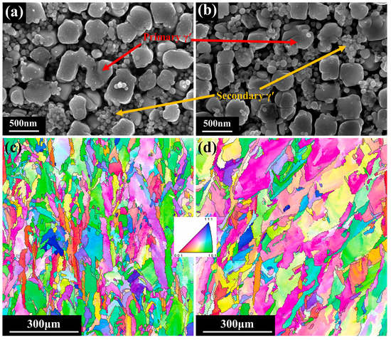 SEM images showing the microstructures (a) IN738LC alloy and (b) Y2O3/IN738LC composit, EBSD mapping showing the grain structure of the (c) IN738LC alloy and (d) Y2O3/IN738LC composit [57].