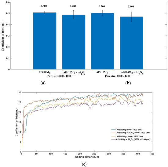 - The AlSi10Mg-Al2O3 composite skeleton with pore size 800 ÷ 1000 μm decreases the COF 4.2% in comparison with the AlSi10Mg skeleton.