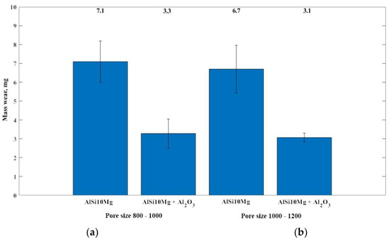 - The AlSi10Mg-Al2O3 composite skeleton with pore size 800 ÷ 1000 μm decreases the mass wear 53.5% in comparison with the AlSi10Mg skeleton.