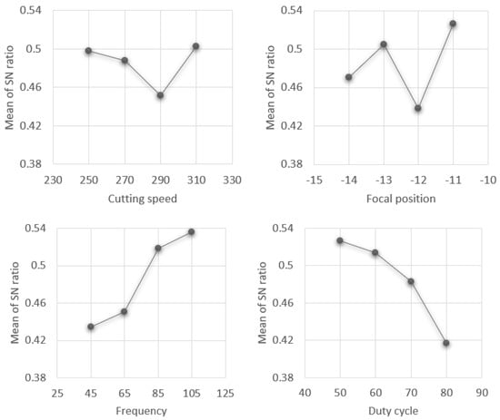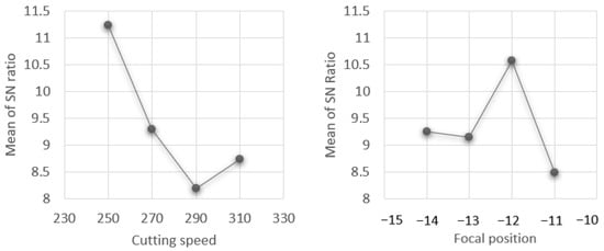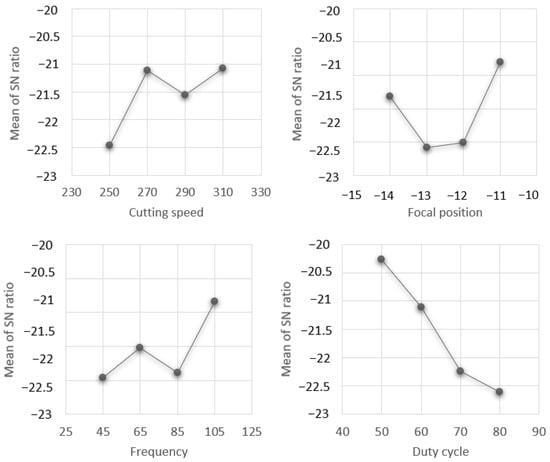 In this research, the Taguchi method was first applied to establish the effect of cutting process parameters for every response individually. Experimental data for surface roughness and kerf width were achieved by an L16 orthogonal array, which was utilized to create a combination of cutting process parameters. S/N ratios and the responses are illustrated in Table 3. The gap between max and min S/N ratios shows each factor’s effect on the response; furthermore, each cutting process parameter on the responses is illustrated in Figure 1 and Figure 2.