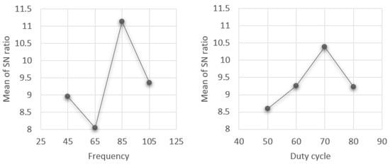 To establish the parameters’ effects on responses, signal-to-noise ratios (S/N) were applied as sensitivity indicators of the desired features of the factors in the Taguchi method. Performance of (S/N) ratios can be evaluated in three categories: larger is better, smaller is better, and nominal is the best. In this study, surface roughness (SR) and kerf width (KW) minimization are the objective functions; moreover, the smaller S/N ratios selected were better, where yi defines the response data from the experiment of the ith parameter and n defines the number of experiments (Equation (1)).