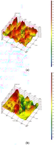 The numerical values obtained from optical profilometer were used to define average surface roughness values. Measurements and tests were assessed according to ISO 25 and ISO 178 declaration standards [36]. Arithmetic mean height (Sa) represents the absolute height from the mean plane. Sa is calculated according to Equation (6). [37]. “A” represents Unit Area, “Z” represents Height, and “x” and “y” represent the measurement coordinates.