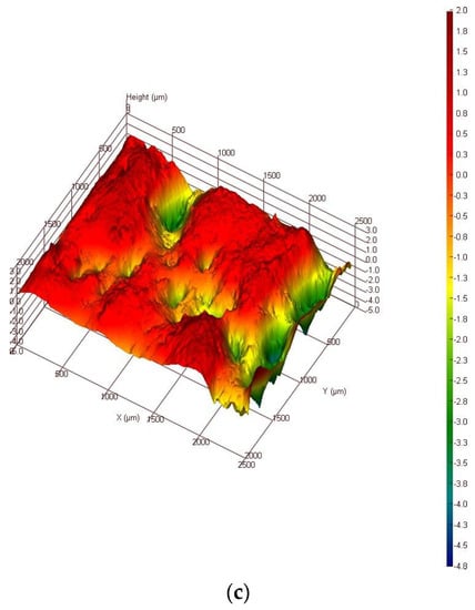 Surface topographies: (a) Sample 13, (b) Sample 15, and (c) Sample 6.