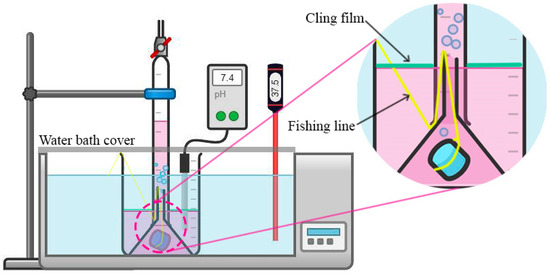 Schematic representation of the experimental setup for the immersion test. The sample was suspended using inert fishing line during the immersion period, with the evolved H2 gas being calculated based on the displaced r-SBF in the burette.