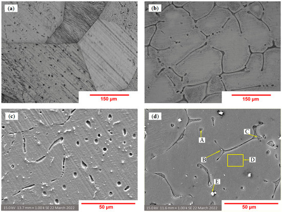Optical microstructure of (a) CP Mg and (b) Mg-1.0Ca-0.5Sr alloy and their corresponding SEM images of (c) CP Mg and (d) Mg-1.0Ca-0.5Sr alloy. The marked yellow points and areas (A–E) in SEM images correspond to the EDS analysis locations in (Table 4).