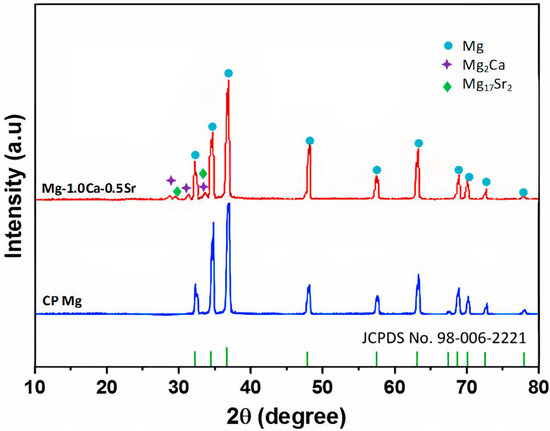The XRD spectra of as-cast CP Mg and Mg-1.0Ca-0.5Sr alloy.