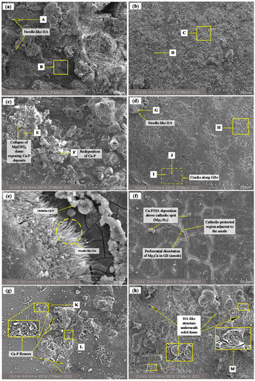 SEM image of deteriorated surface of CP Mg and Mg-1.0Ca-0.5Sr alloy in r-SBF under different pH regulation treatment. CP Mg in (a) uninterrupted r-SBF solution, MgSBFx; (b) interrupted r-SBF solution, MgSBFR; and (c) Tris-HCL buffered r-SBF solution, MgSBFT. Mg-1.0Ca-0.5Sr alloy in (d) uninterrupted r-SBF solution, M2SBFx; (g) interrupted r-SBF solution, M2SBFR; and (h) Mg-1.0Ca-0.5Sr alloy in Tris-HCL buffered r-SBF solution, M2SBFT. The images (e,f) show a magnified perspective of the dotted square and needle-like HA structure in (d). The annotated yellow points and areas (A–M) in SEM images correlate to the locations of the EDS analysis (Table 5).