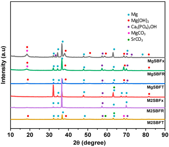 From Figure 7b,c, a hypothesis can be derived that the lower pH value in r-SBF could be a mark of better corrosion resistance. This is due to the multiple passivation provided by the Mg2+, Ca2+, , and HPO42− species within r-SBF that form CaP and HA that starts at a lower pH [6], rather than only depending on the reaction of Mg2+ and OH− to form Mg(OH)2. In addition, M2SBFT exhibits lower pH value than MgSBFT, indicating better corrosion resistance induced by the alloying elements, which is in accordance with the results in the H2 evolution test and mass loss measurement. However, this hypothesis is not applicable when comparing the treatment conditions with Tris-HCL buffered r-SBF.