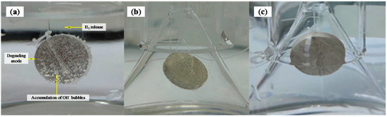 Photograph of Mg-1.0Ca-0.5Sr alloy immersed in r-SBF with increasing immersion time. (a) Rapid anodic dissolution during early immersion results in higher OH− accumulation over the cathodic area during the earliest 1 h immersion; (b) slower anodic dissolution and reduced OH− accumulation were observed at 48 h, indicating active precipitation of corrosion products on the alloy surface; and (c) unnoticeable OH− accumulation at the increased immersion time (336 h), suggesting a uniform coverage of passivating deposits across the alloy’s surface at 336 h.