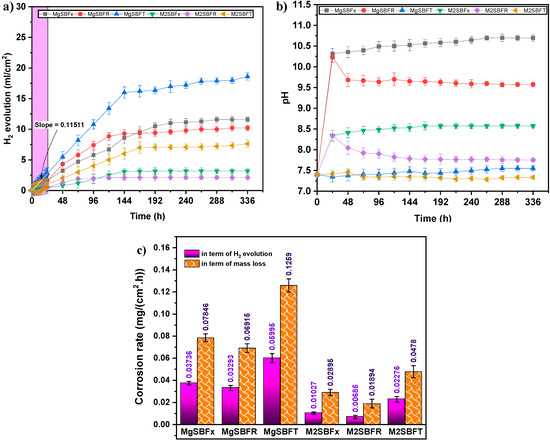 From Figure 7a, both the CP Mg and Mg-1.0Ca-0.5Sr alloy follow an identical evolution trend under all treatment conditions, in which abrupt H2 release was observed in the early immersion phase, suggesting rapid dissolution of the anode which is striving for a dynamic equilibrium state [56]. Then, the H2 release slowed down before reaching a stabilized evolution rate. This profile may be attributed to the gradual growth of protective precipitation coverage across the surface, except for MgSBFT and M2SBFT, in which a continuous climb was seen until the end of immersion period.