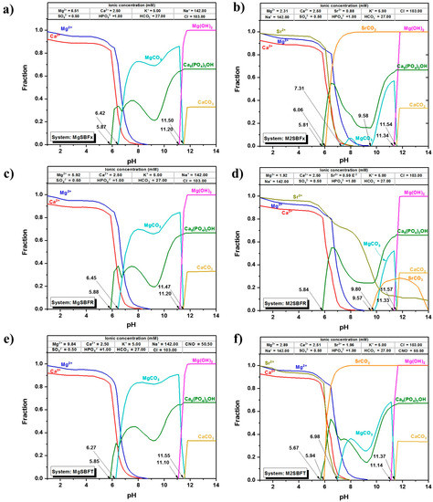 Simulated Hydra–Medusa diagram of either Mg2+, Ca2+, or Sr2+ fraction against pH value based on thermodynamic constant. (a,c,e) display the simulated diagram with predicted corrosion products of CP Mg in r-SBF solution under three treatment conditions. (b,d,f) illustrate the possible precipitate that resulted from Mg-1.0Ca-0.5Sr alloy immersion. The labelled pH values indicate the minimum pH value to initiate the formation of Mg(OH)2, Ca5(PO4)3OH, MgCO3, CaCO3, and SrCO3. The summarized possible corrosion products in different corrosion media and pH-regulating conditions are listed in Table 6.