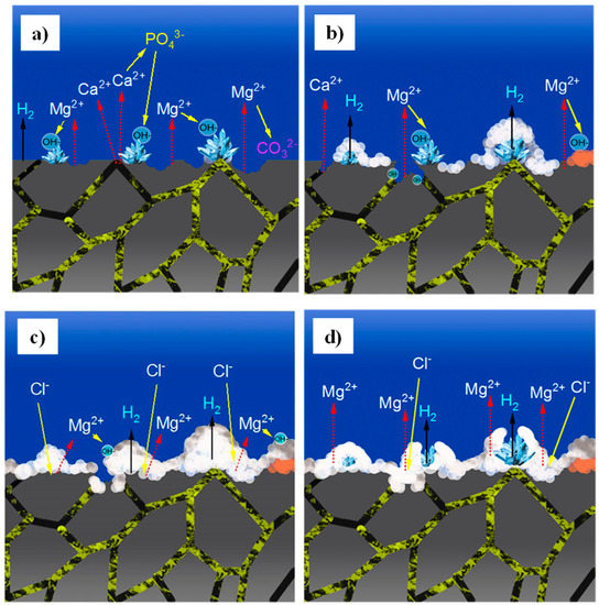 This observation supports the widely accepted theory that accelerated Mg degradation in aqueous media generates H2 gas and precipitates Mg(OH)2 simultaneously (Equations (2)–(5)) [40,41].