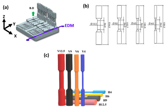 Standard cylindrical dog-bone specimens were designed and fabricated in two build orientations: vertical (V) and horizontal (H), i.e., parallel and perpendicular to the build direction. The as-built samples were removed from the build-plate using wire electron discharge machining (EDM) and then machined with precision CNC to attain the cylindrical tensile bars of gauge diameters 4, 6, 9, and 12.5 mm, in accordance with ASTM standard E8/E8M [33] (Figure 1). For each test described in the following sections, at least three repeats of every sample were manufactured for statistical confidence in the data collected. Hereon, these samples will be referred to as (H4, H6, H9, and H12.5) and (V4, V6, V9, and V12.5), for the horizontal and vertical samples, respectively.